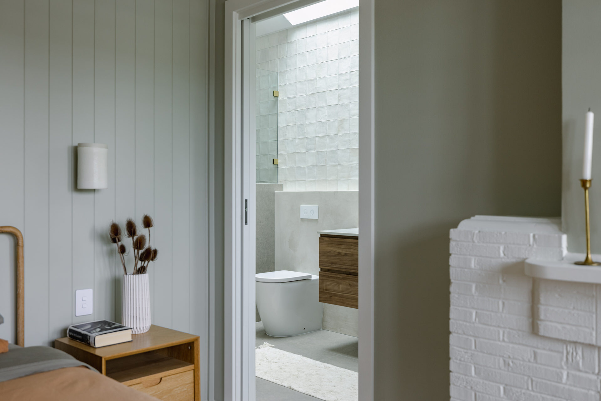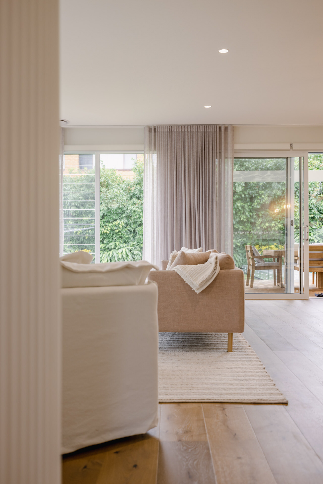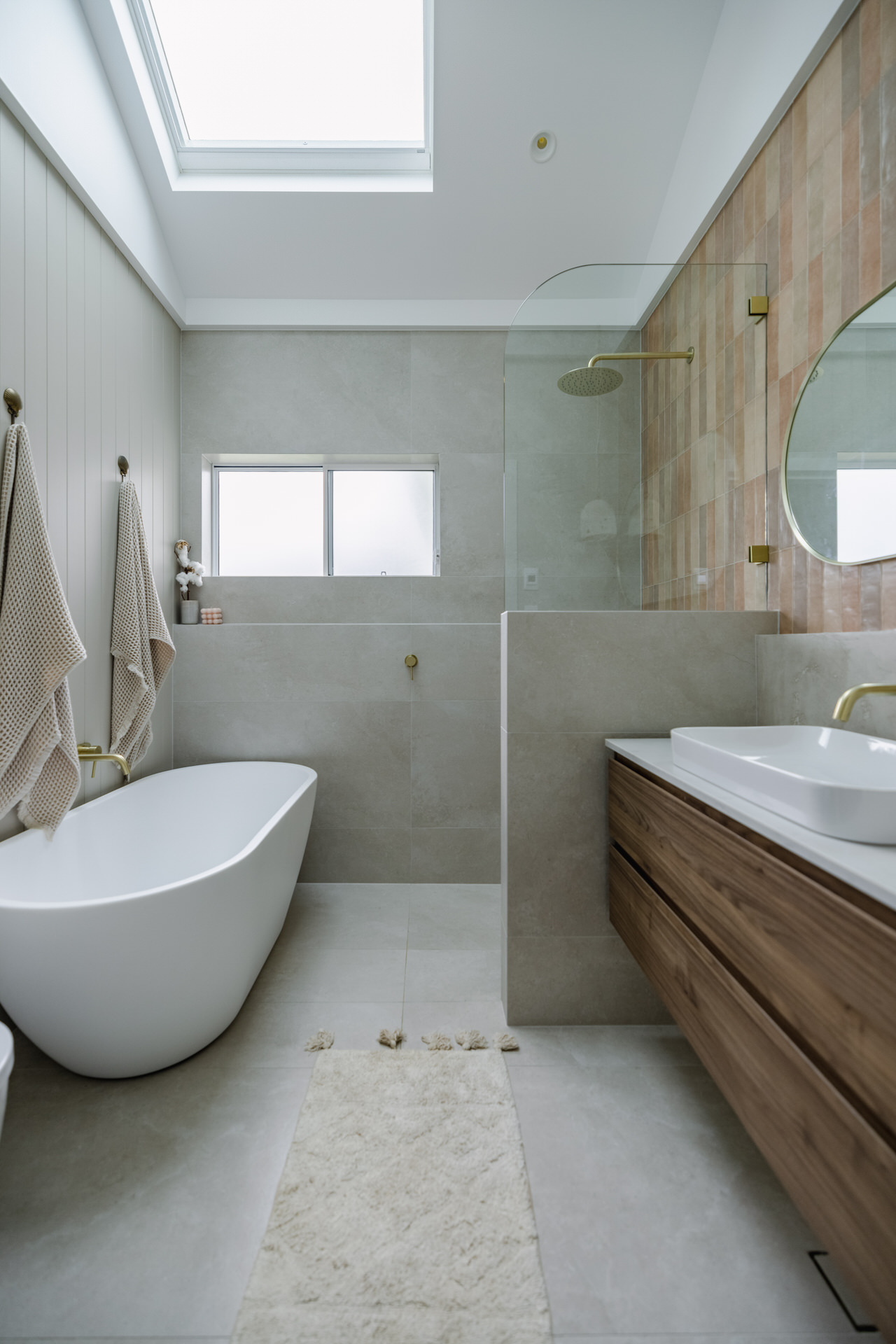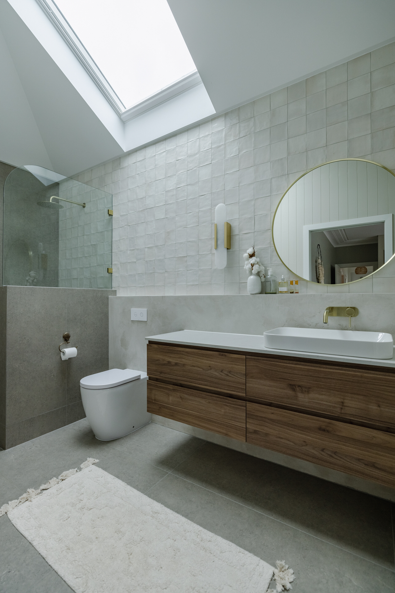 Breathing new life into a tired red brick classic, we introduced soft curves throughout the home to create a sense of movement and warmth, while detailed finishes added a layer of modern comfort. Skylights in the bathrooms flood the space with natural light, and breeze blocks nod to the coastal setting. In the backyard, a sparkling pool completes the transformation, turning an outdated home into a relaxed, functional retreat.