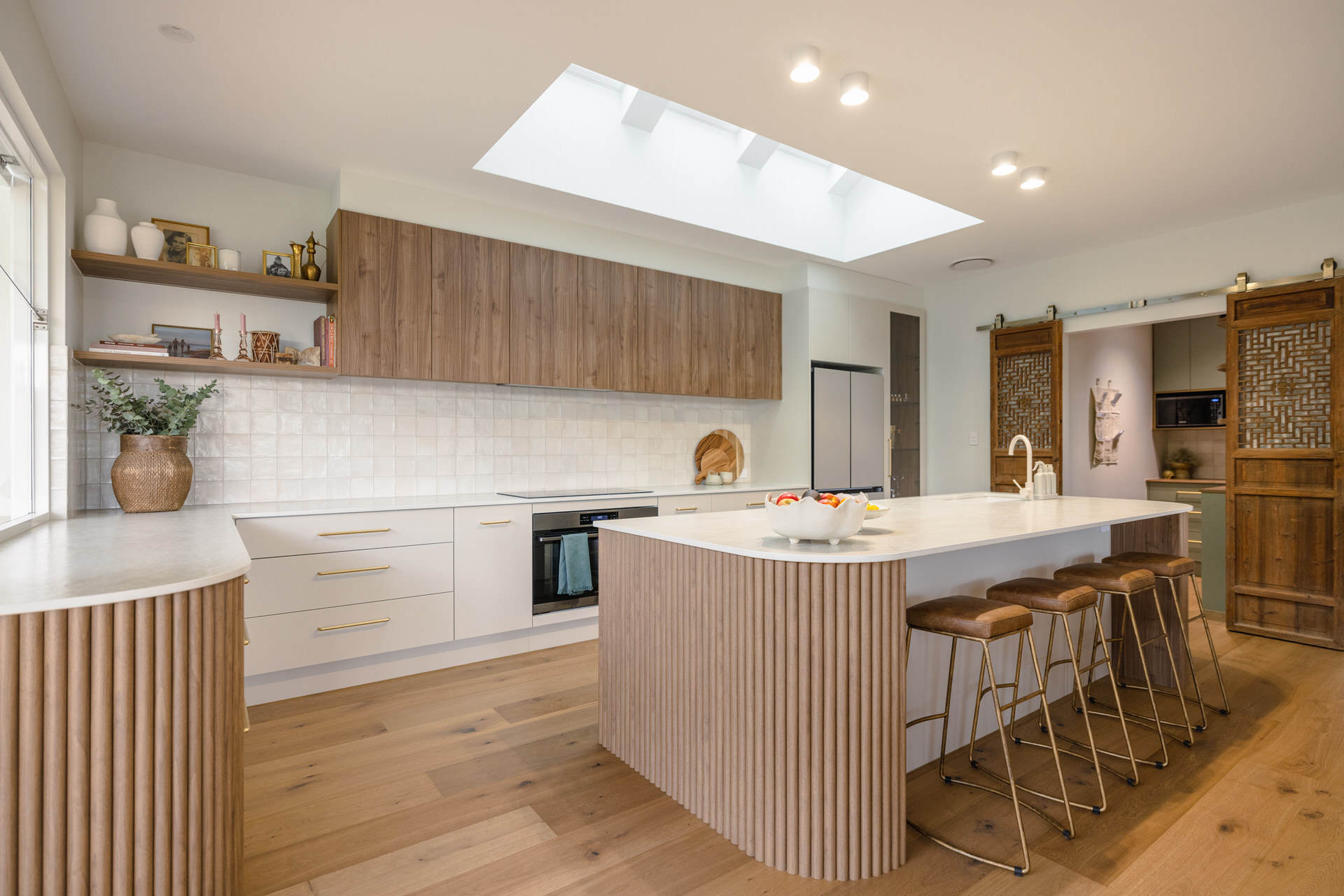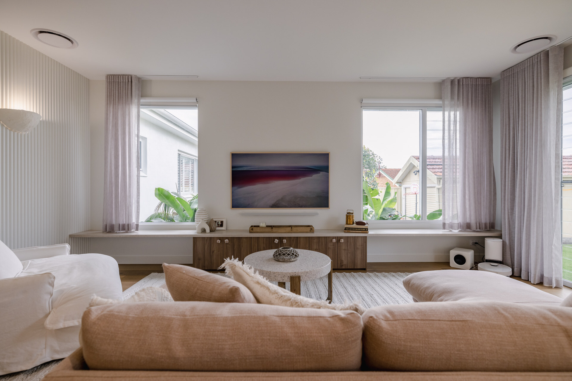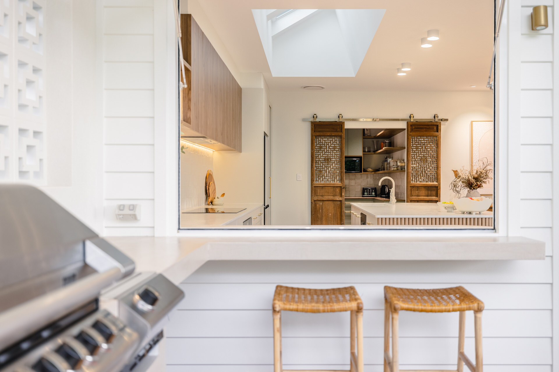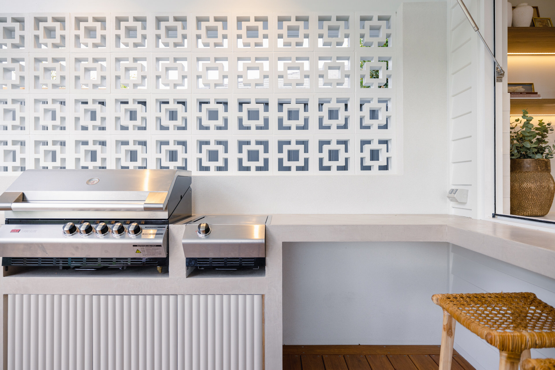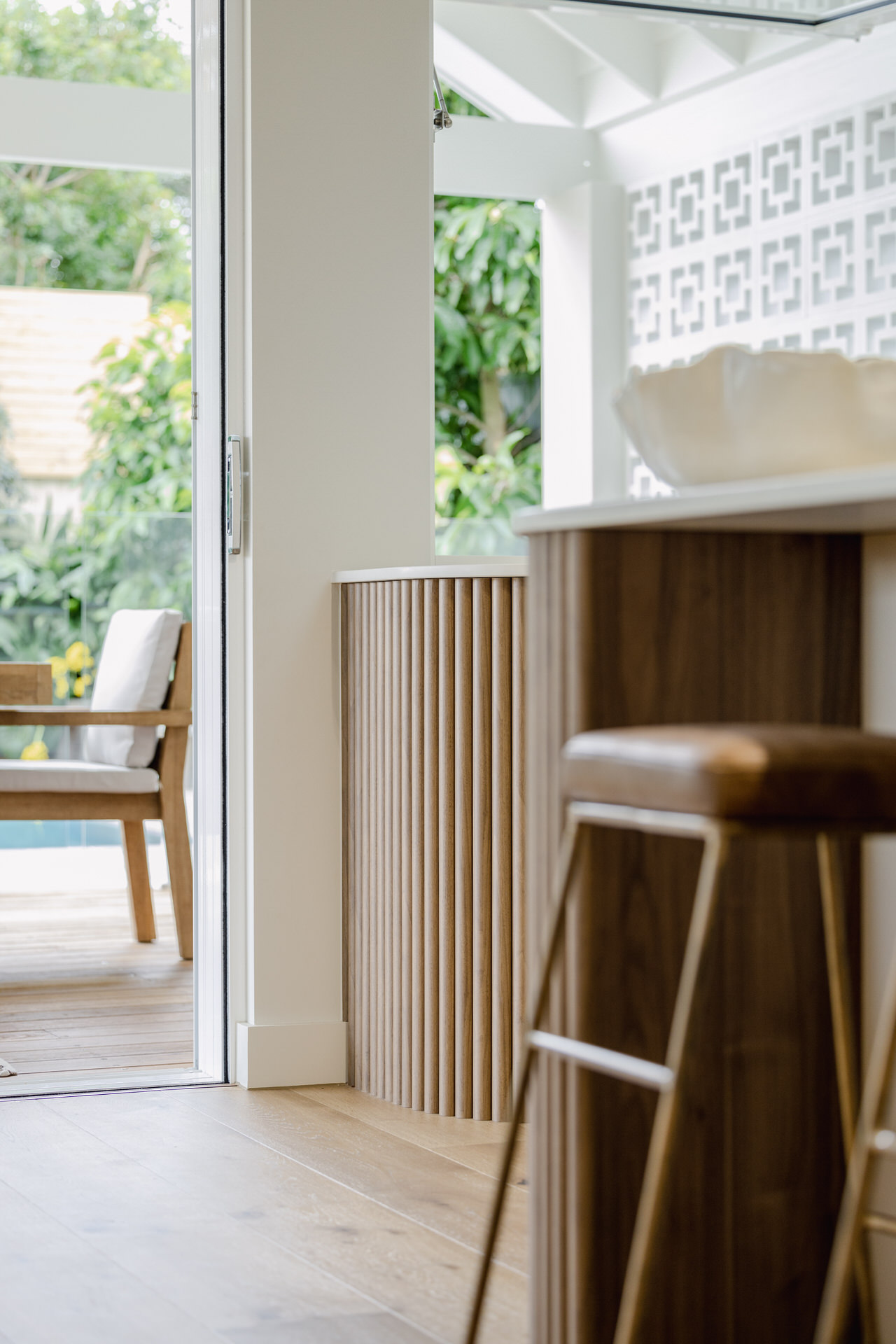 Breathing new life into a tired red brick classic, we introduced soft curves throughout the home to create a sense of movement and warmth, while detailed finishes added a layer of modern comfort. Skylights in the bathrooms flood the space with natural light, and breeze blocks nod to the coastal setting. In the backyard, a sparkling pool completes the transformation, turning an outdated home into a relaxed, functional retreat.