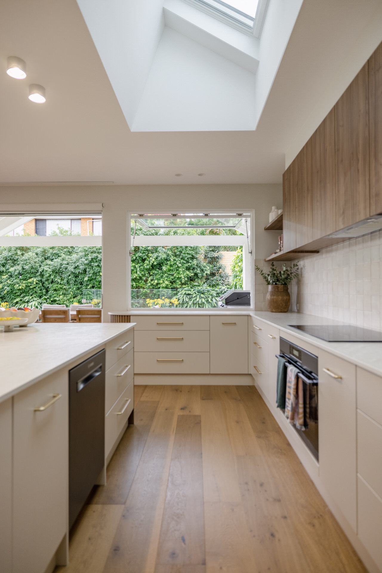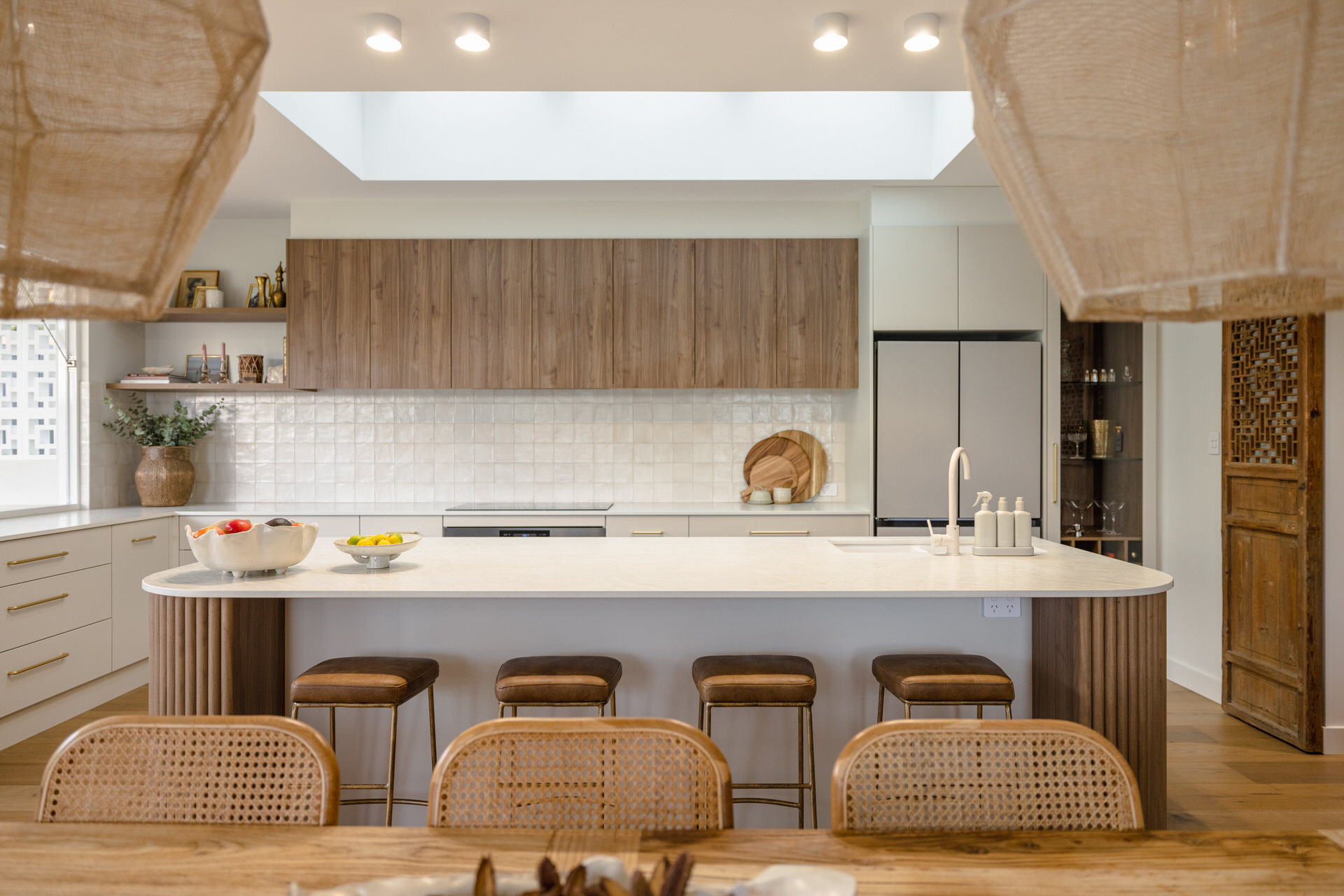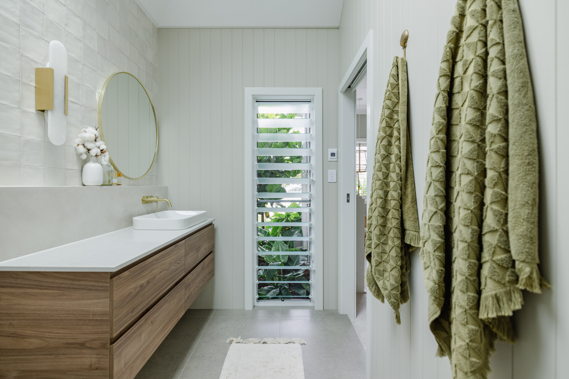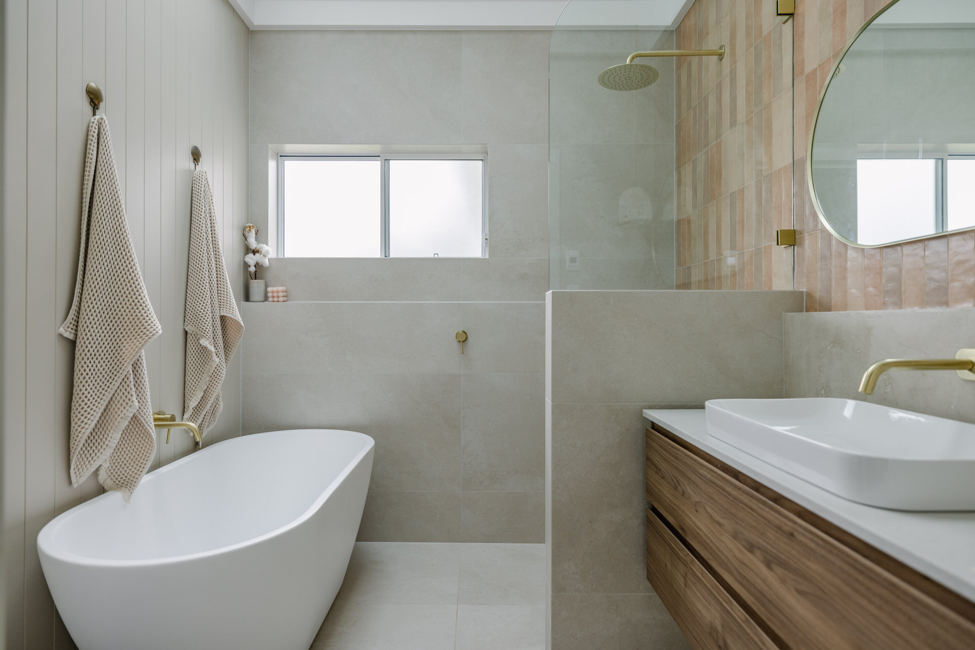 Breathing new life into a tired red brick classic, we introduced soft curves throughout the home to create a sense of movement and warmth, while detailed finishes added a layer of modern comfort. Skylights in the bathrooms flood the space with natural light, and breeze blocks nod to the coastal setting. In the backyard, a sparkling pool completes the transformation, turning an outdated home into a relaxed, functional retreat.