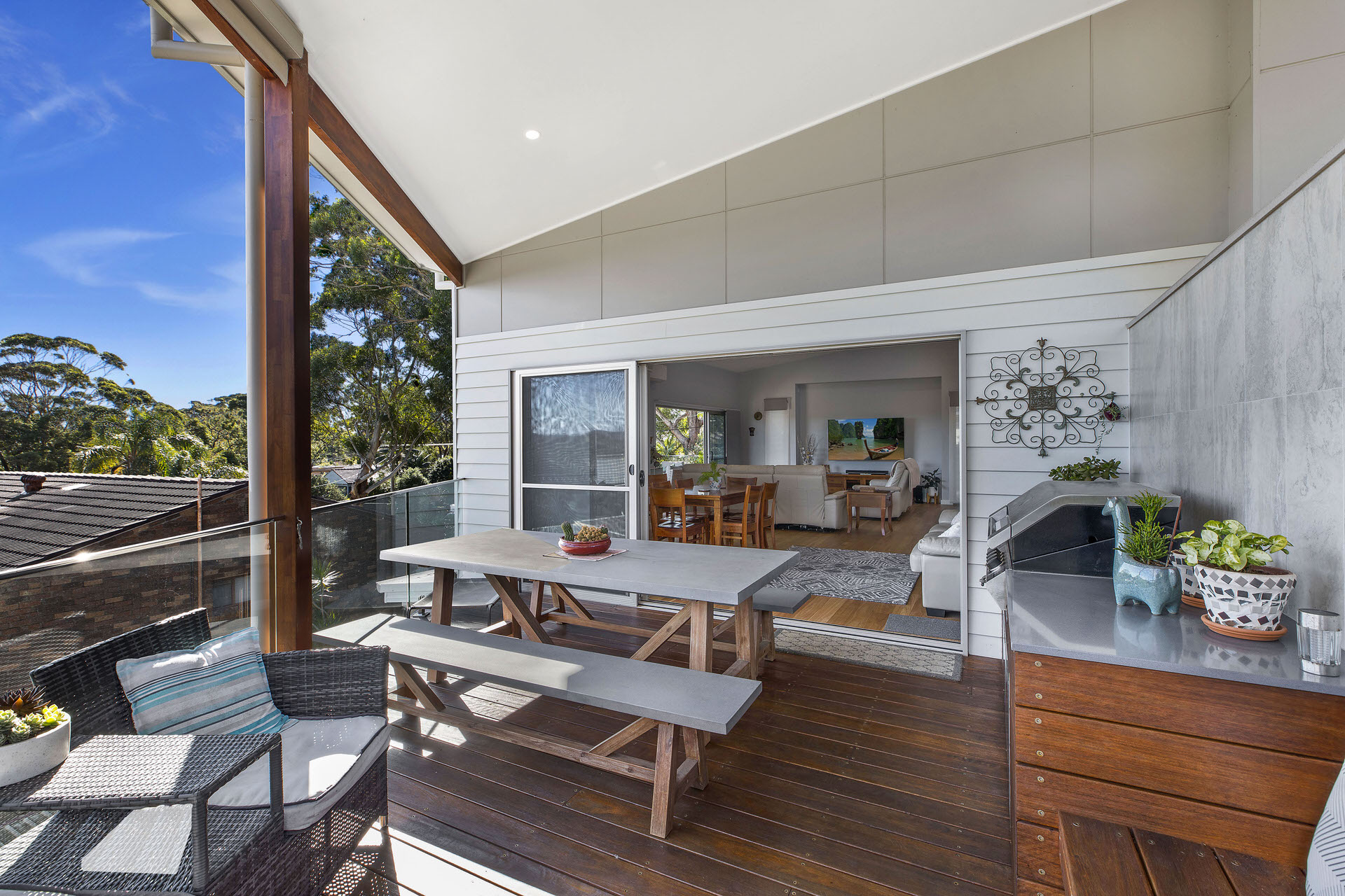 A knock down and rebuild on this tight and tricky corner block in East Bateau Bay has created a nice elevated home with amazing views. The challenge for this project was designing and building the house to accommodate the surrounding native trees.