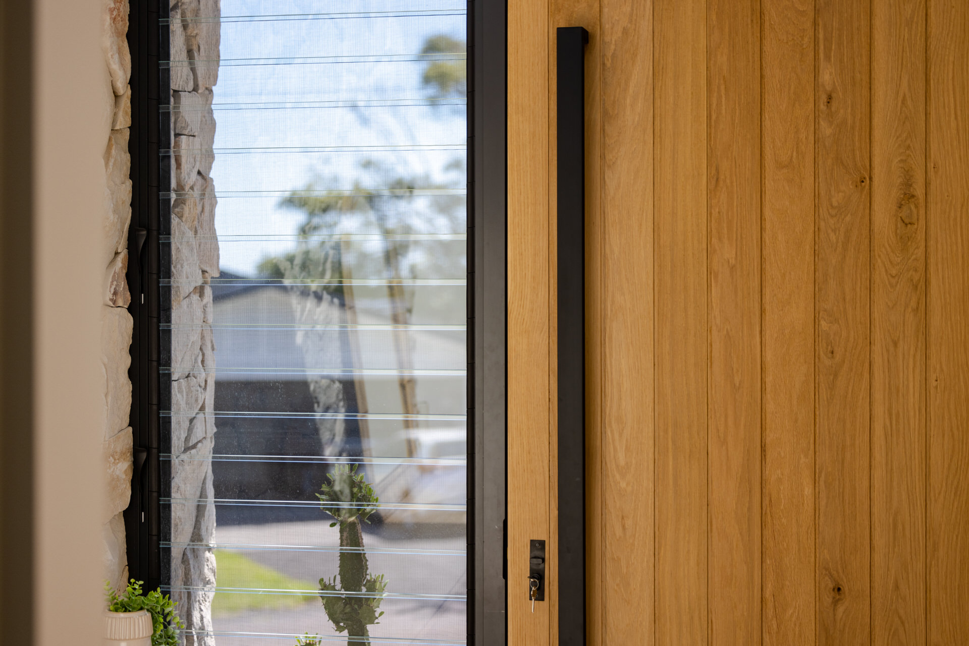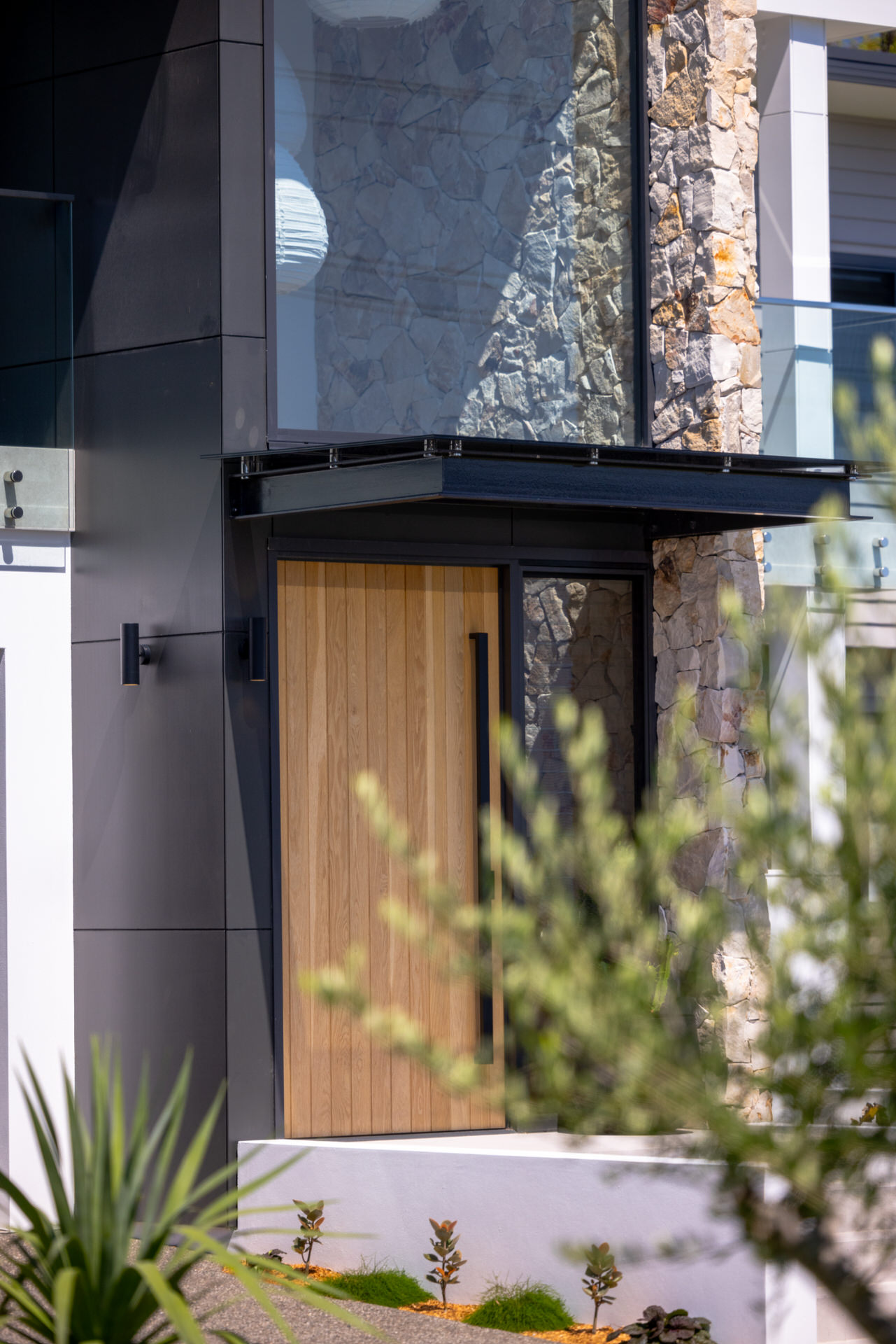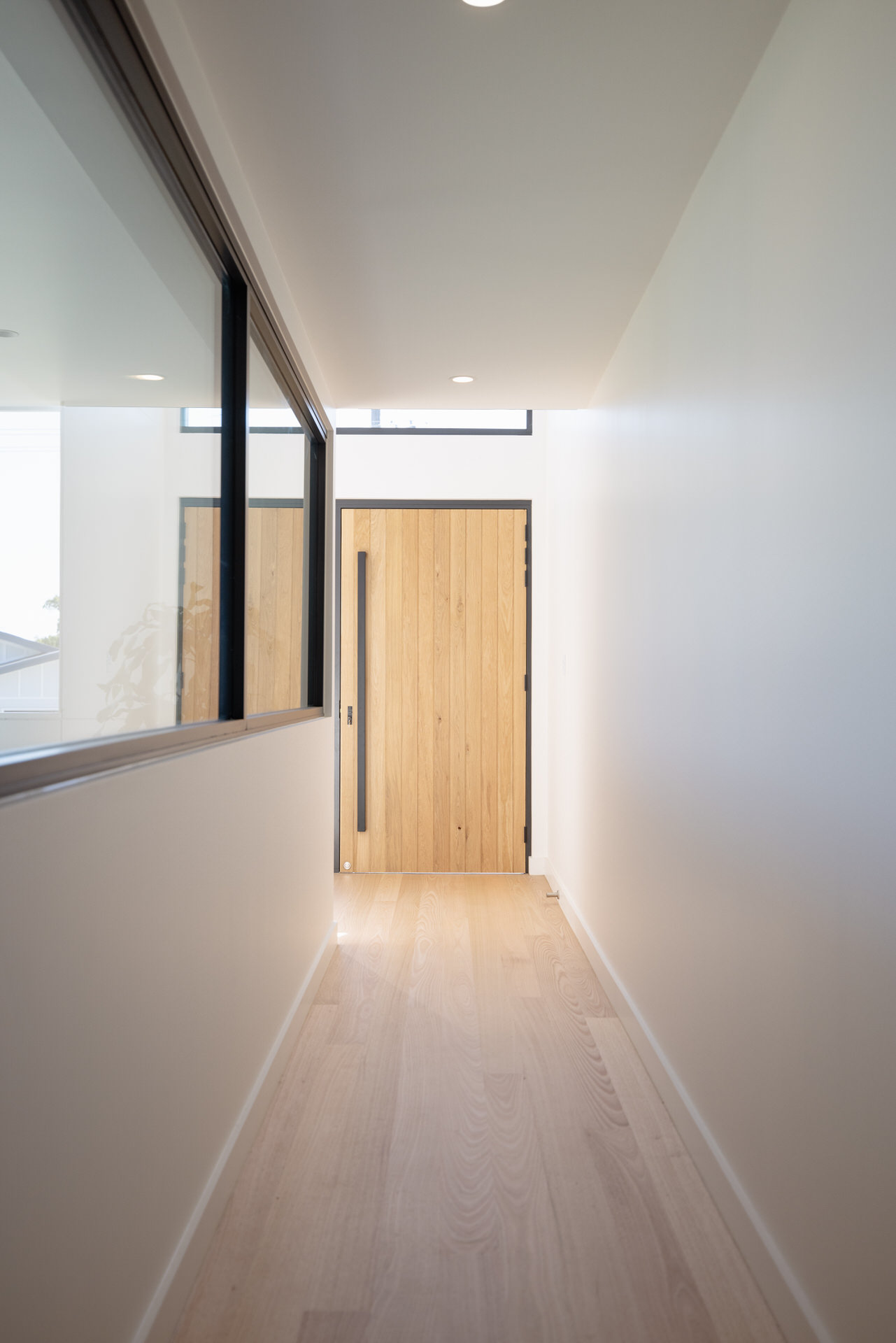 A custom American oak front door sets the tone on arrival, opening to natural hardwood timber floors and soft, considered lighting throughout. Outside, exposed concrete surfaces meet beautifully landscaped areas, creating a home that feels grounded, light-filled, and ready for life on the coast.