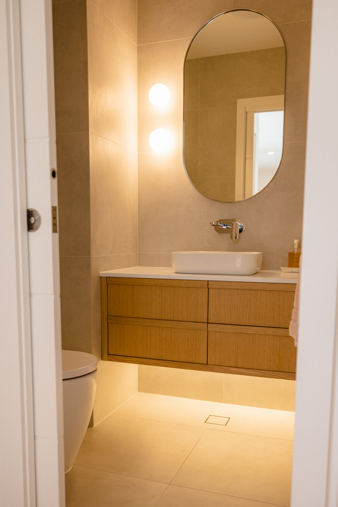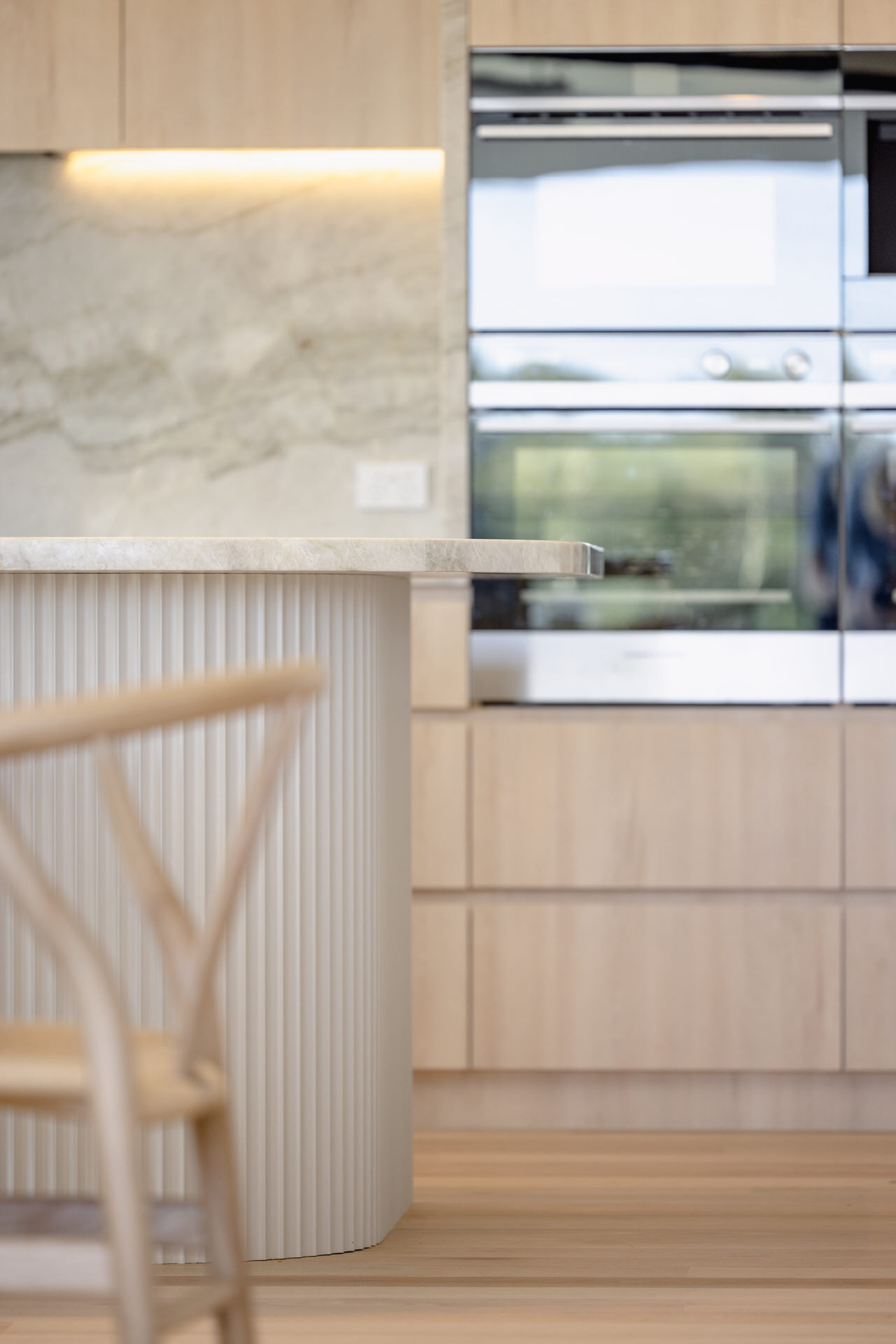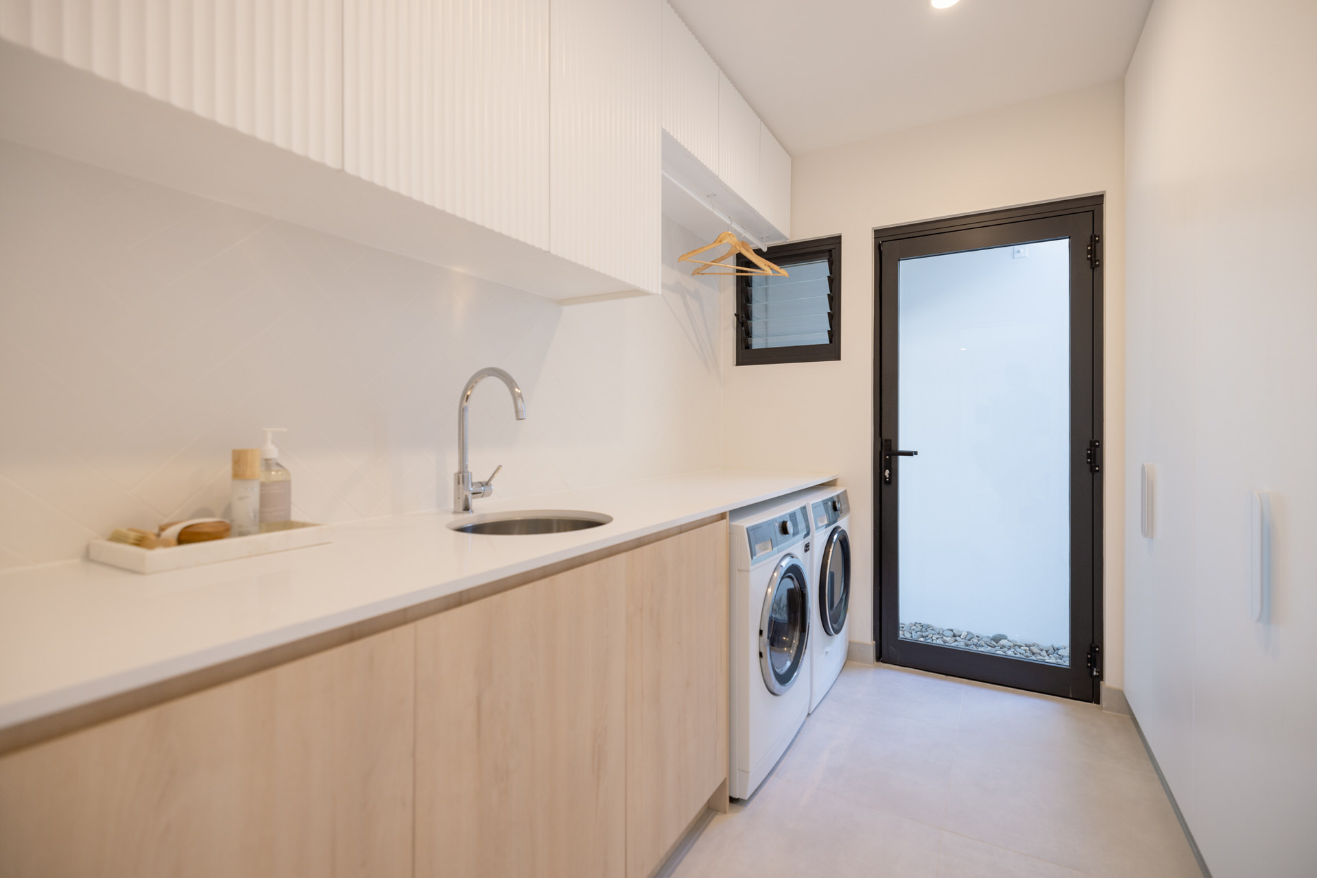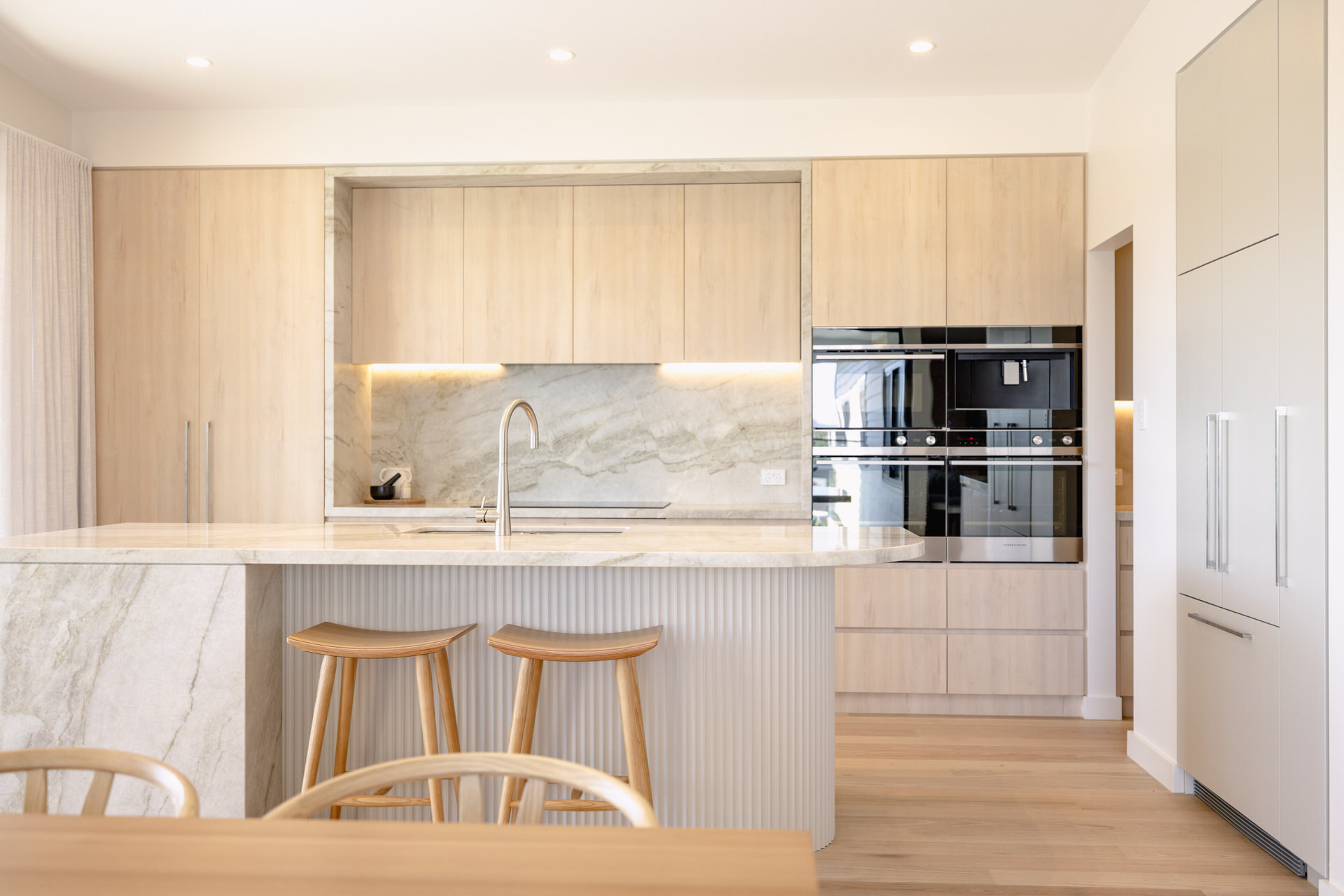 A custom American oak front door sets the tone on arrival, opening to natural hardwood timber floors and soft, considered lighting throughout. Outside, exposed concrete surfaces meet beautifully landscaped areas, creating a home that feels grounded, light-filled, and ready for life on the coast.